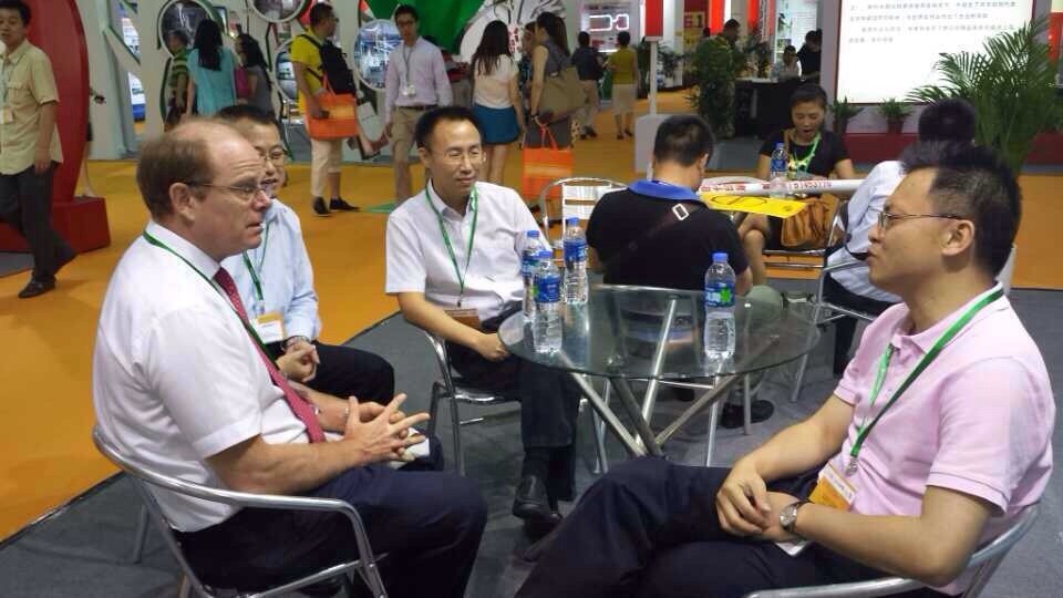 中南传媒副总经理,湖南天闻印务公司董事长潘晓山(右一),与展厅现场客户会谈