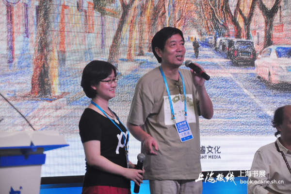 画家黄石(右)为读者介绍《最美的上海》编辑