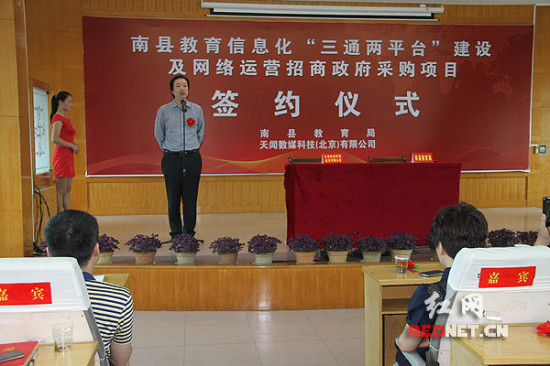 签约仪式上,南县教育局局长翦万能就南县教育信息化“三通两平台”建设与网络运营等发言。