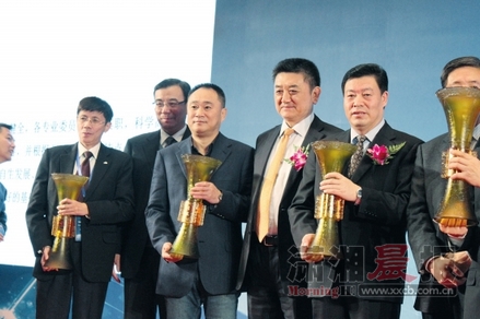 中南传媒获得“2012年度上市公司董事会奖”,董事长龚曙光(中)上台领奖。