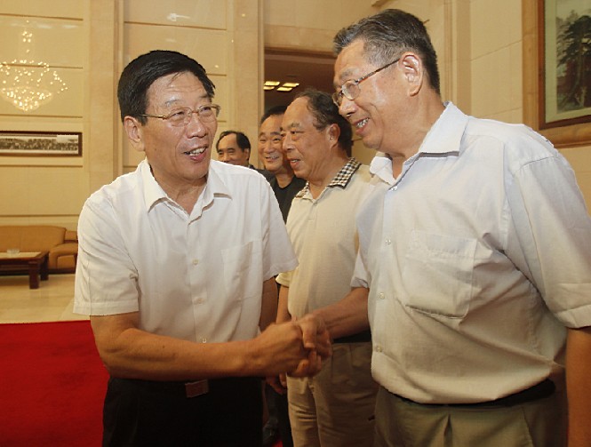 《湖湘文库》编辑出版领导小组顾问徐守盛(左一)与编委会成员握手。