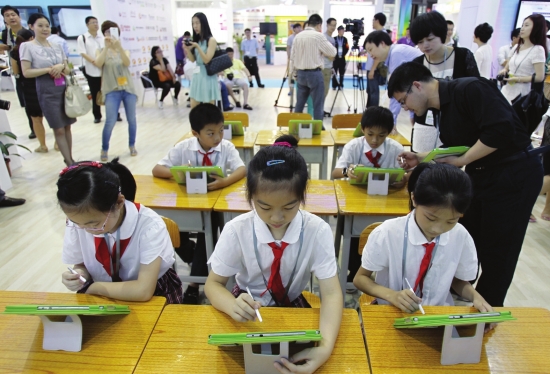 在演示上课的过程中,“老师”手执平板电脑,“学生”的课桌上也每人有一台平板电脑。“老师”播放的拔河比赛动画,“学生”在自己的平板电脑上可以同步看到,并在电脑上完成习题。电脑系统后台可以实现对每位学生所做客观题的对错进行判分,并反馈到“老师”手中的电脑上,老师据此掌握到了每个学生课堂学习情况,并可以进行重点教学和分层次教育。