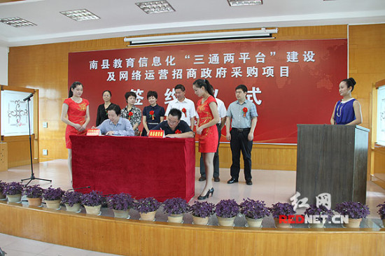 6月4日,湖南益阳市南县教育局大会议室座无虚席,南县教育局与天闻数媒科技(北京)有限公司就教育信息化“三通两平台”建设及网络运营签订了合作协议。根据协议,天闻数媒科技(北京)有限公司在合约签订后的90个工作日内为南县所有学校建成“三通两平台”,标志着南县教育信息化即将跨入“高速时代”。