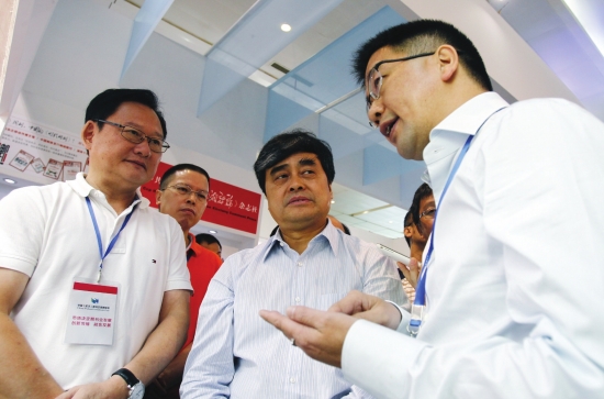 9月18日,吴尚之(中)在朱建纲(左一)的陪同下,来到湖南展馆,认真了解湖南期刊发展状况。