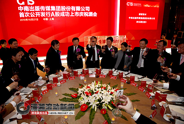 红网上海10月28日讯(潇湘晨报记者 张冬萍)时隔六年之后上海证券交易所的铜锣将再次为湖南企业敲响。发行期间备受资金追捧的中南传媒(601098)10月26日晚间公告,公司股票将于10月28日起上市交易。昨晚,中南传媒在上海举行上市庆典酒会,中宣部副部长孙志军,国家新闻出版总署副署长邬书林,湖南省委常委、宣传部长路建平等出席酒会,共同开启中南传媒对接资本市场、二次创业的新征程。